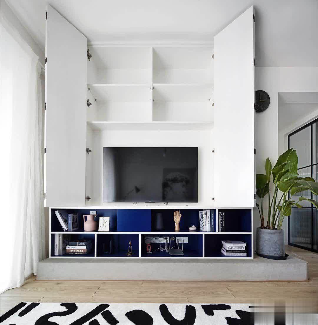 为了防止家里的小孩子长时间看电视会影响视力,所以将电视机设计在了柜子里面,不仅可以防止孩子长时间看电视,还可以增加客厅的储物空间。