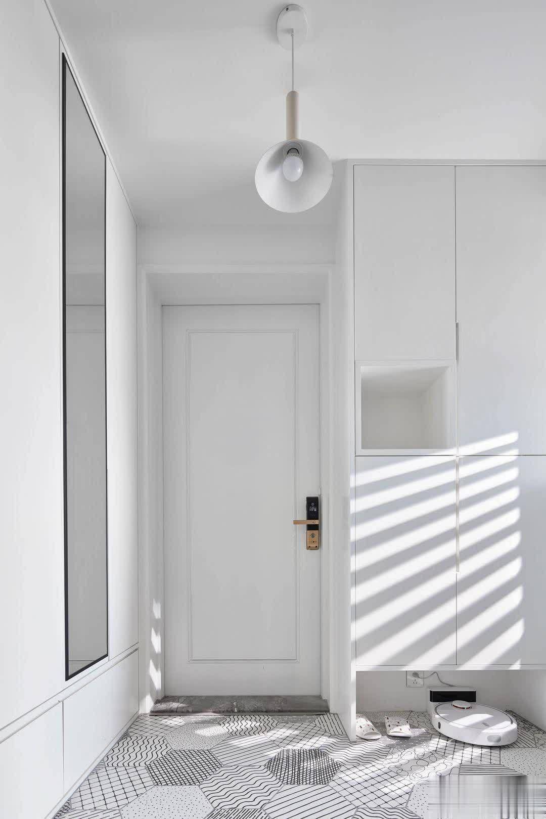 本来进门的位置比较小,不过房间的面积比较小不能设计一个独立的玄关空间,只能在靠着墙壁的位置设计了一个比较窄的鞋柜,鞋柜可以满足一家人的日常需求忠泰策略,黑白简约的色彩运用也在视觉上扩大了空间。
